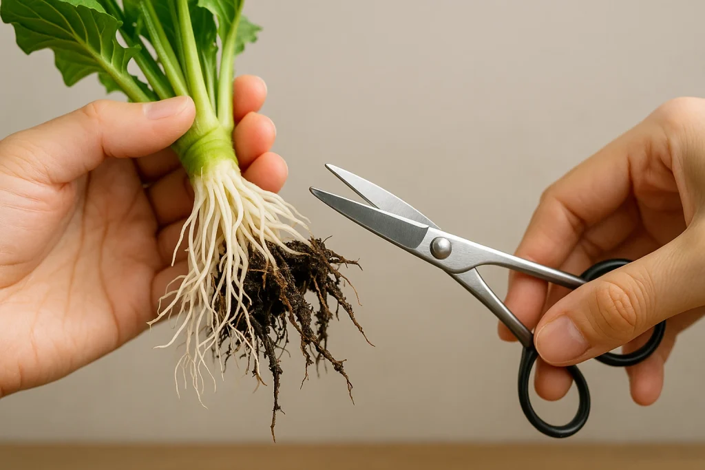まず行うべきは、鉢から株を取り出して根の状態を確認することです。健康な根は白くてしっかりしていますが、黒く柔らかくなっている部分は腐敗しています。これらの部分を清潔なハサミで切り落としましょう。その後、水で軽く土を洗い流し、1〜2時間ほど風通しの良い場所で陰干しします。